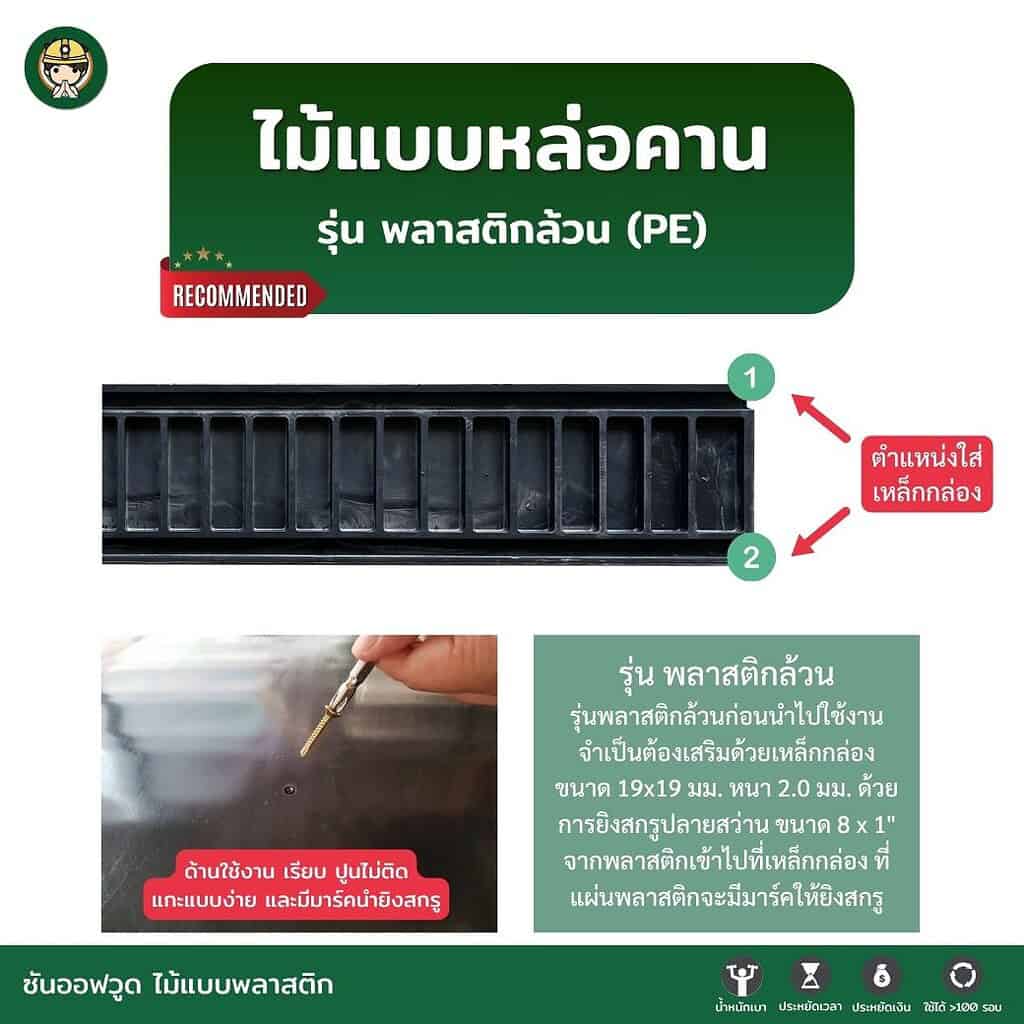 มีให้เลือกทั้งไม้แบบพลาสติก, ไม้แบบพลาสติกเสริมเหล็ก และไม้แบบพลาสติกเสริมเหล็ก พร้อมอุปกรณ์รัด (แบบครบชุด)